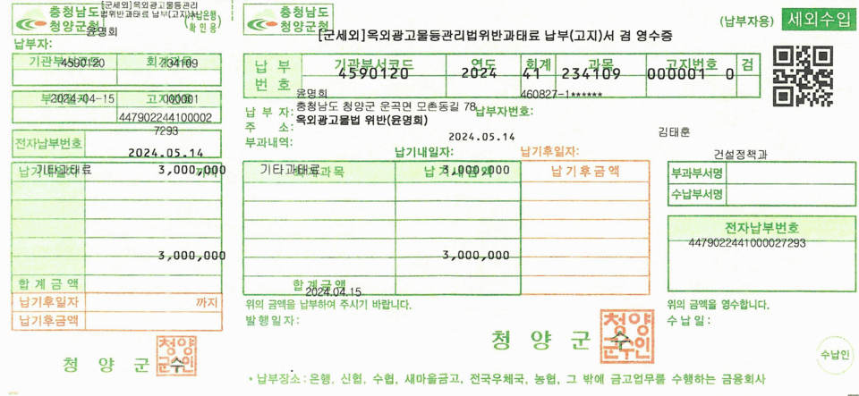 윤명희 회장은 청양군의 부당한 과태료 처분과 관련하여 “과태료 결정에 대한 이의신청서”를 제출하여 대전지방법원 공주지원의 판결로 300만 원의 과태료 처분은 취소되었다.