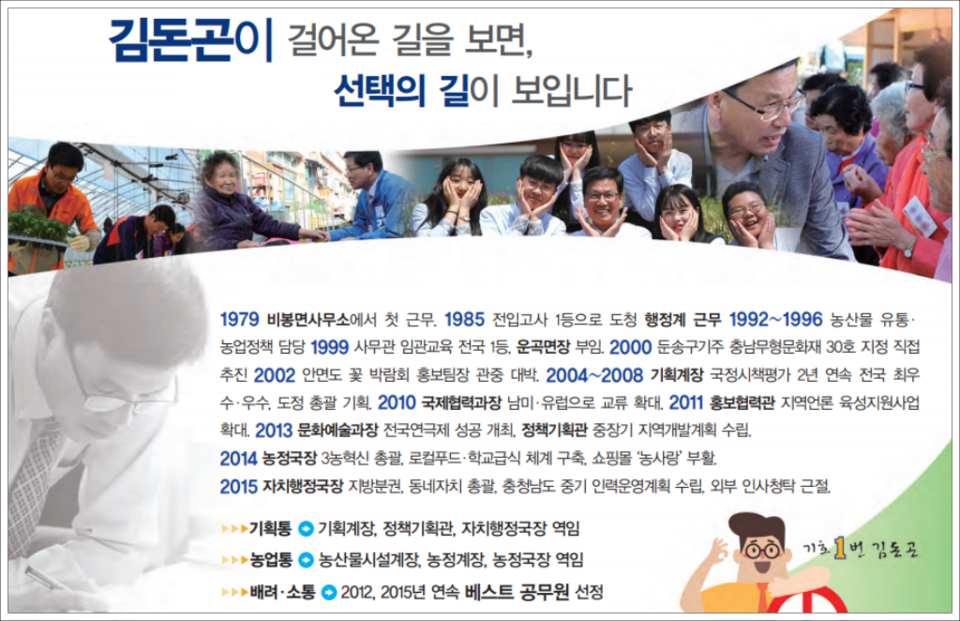 그러나 김돈곤 군수는 설 명절 등에 자신을 홍보하는 불법 현수막을 청양군 곳곳에 설치한 부분을 비교하면 군수라는 우월적 지위를 활용하여 지역의 어르신들을 대상으로 갑질 행정을 펼치고 있음을 방증한다.